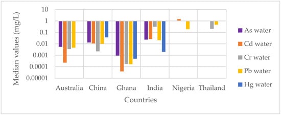 The median values of the concentrations of heavy metals (As, Cd, Cr, Pb and Hg) in water by country are summarized in Figure 3. In addition, Table 2 summarizes the middle and upper values of each heavy metal, each sample type and sample size. The Supplemental Materials provide details on sample sizes and middle and upper values of each heavy metal.