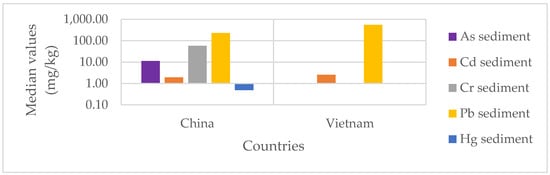 The median values of heavy metal concentrations (As, Cd, Cr, Pb and Hg) in sediment by country are summarized in Figure 4. In addition, Table 2 summarizes the middle and upper values of each heavy metal, each sample type and sample size. The Supplemental Materials provide details on sample sizes and middle and upper values of each heavy metal.