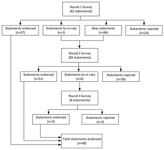 From the literature searches and notes recorded at the workshop described before, 62 statements were presented to the panel for rating in Round 1. Feedback from the experts contributed to 84 new statements and one statement from the previous round that needed to be reappraised in Round 2. In Round 3, six items were presented for re-rating. Figure 1 shows the number of statements in each survey round that were endorsed, rejected or presented for reappraisal in the next round.