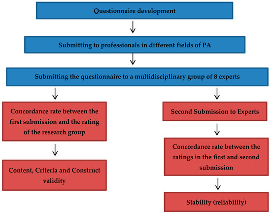 Thus, an important aspect of these recommendations will be to know the assessment of PA levels. Along these lines, there are different instruments for assessing the PA carried out by any group of society. These instruments must have as indispensable characteristics good validity and reliability so that they can be used for future research [8]. Likewise, all these instruments must undergo a validation process, which is a prerequisite for ensuring their quality for application [9]. Some authors, such as Galicia et al. [10], differentiate several types of validation methods when carrying out this process, such as construct validity, criterion validity, and content validity. Thereby, Haynes et al. [11] define content validity as “the degree to which elements of the measurement instrument are comprehensive, relevant, and representative of the construct for a particular assessment purpose” (p. 238). The most precise and purely objective ones used to measure PA, such as indirect calorimetry and direct observation, are hardly applicable and excessively expensive [12]. It announces that one of the most used techniques to estimate the level of PA in epidemiological studies is the PA questionnaire. Since it is a practical and simple tool to determine the level of PA in older people, this type of instrument is very appropriate to study the level of PA in large populations [13]. The ease of administration, the minimal burden on respondents, and the low cost were highlighted among other factors [14].