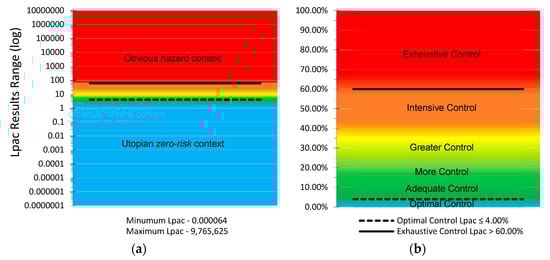 Figure 11a,b show the same results but with a different scale on the left vertical axis. The upper graph shows the results with a natural scale, and the lower graph shows the results with a logarithmic scale. The continuous horizontal line corresponds to the value of 60, from which exhaustive control of preventive action is required (obvious danger zone-red). The method is very sensitive to assess and detect hazards. To correct dangerous situations, preventive actions in constructive prevention systems (Ec), effective participation in prevention (Pi), and good levels of worker satisfaction (Ls) are necessary.