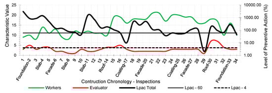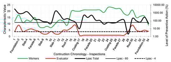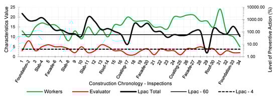 Figure 10 show the results of the level of preventive action (black) and the perception of risk by the workers and the evaluator (green and red, respectively). The horizontal axis shows the correlative numbers concerning the inspection days. Likewise, the construction chronology indicates the construction systems, whose general result indicates that exhaustive preventive action control is required.