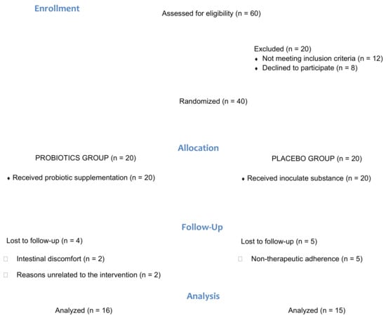 Participants were randomly assigned to the following groups: experimental (ERGYPHILUS Plus (Laboratorios NUTERGIA S.L., San Sebastián, Spain)), which contained Lactobacillus rhamnosus GG, L. paracasei, L. acidophilus and Bifidobacterium bifidus (revivification of 6 million germs per capsule, 4 capsules per day, n = 16), or placebo (n = 15). The placebo capsules were composed of cellulose and provided by Complementos Fitonutricionales S.L. (Spain). The evaluation was performed both before the treatment (baseline) and after 8 weeks of treatment (post-intervention). More information about the procedure can be found in the first part of the study []. The duration of treatment was selected according to similar, previous research [,].
