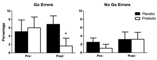 In this task, we analyzed the error rate for the Go conditions, or errors of omission trials, the percentage of errors in the No-Go conditions, or errors of commission, and the average of the medians of the RTs obtained in the Go trials (Table 5) by participants in both groups. These data were analyzed using analysis of variance with one factor manipulated between subjects, group (placebo, probiotic), and one factor manipulated within subjects, treatment (pre-, post-). The ANOVA of errors of omission showed a marginal effect of the interaction group x treatment (F1, 24 = 3.62; p = 0.069). Furthermore, a marginal effect of group (F1, 24 = 3.56; p = 0.071) was observed post-treatment in the Go condition (Figure 2). No other effect or interaction was statistically significant (p > 0.05).