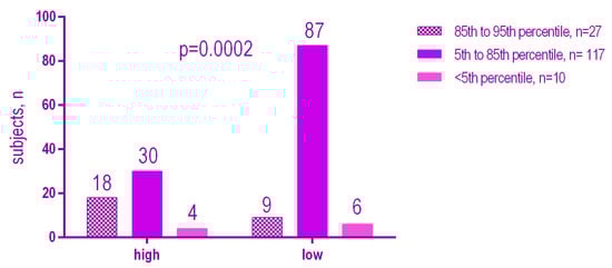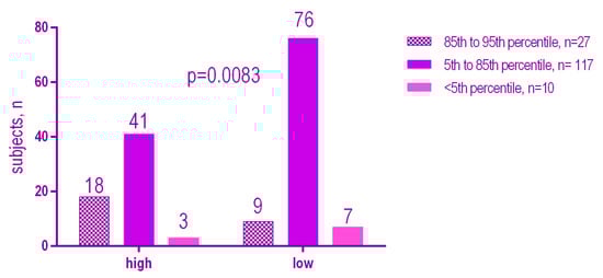 | Group 1 <5th Percentile, n = 10 | Group 2 5th to 85th Percentile, n = 117 | Group 3 85th to 95th Percentile, n = 27 | p-Value | ||