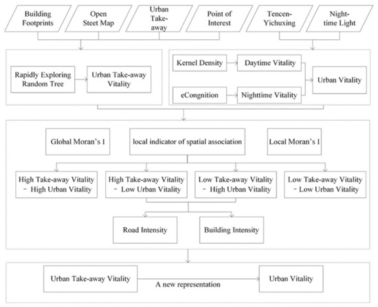Based on the use of multi-source big data, this study proposes a new urban vitality index based on the distribution of urban food takeaway delivery, i.e., the urban takeaway vitality. The quantification of the urban takeaway vitality and the analysis of its spatial correlation with the urban vitality conducted in this study further supplements relevant research on the urban vitality, which will be of significant value to the sustainable development of urban cities in the future.