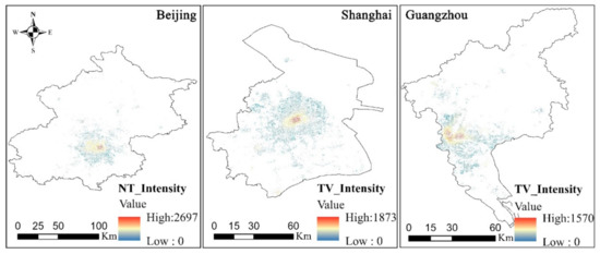 Figure 5 shows the NV distribution of Beijing, Shanghai, and Guangzhou, which was obtained using the monthly mean LuoJia-01 night-time light data from December 2018 to December 2020. Based on Figure 5, for the distribution of high and low NV values, Beijing has the highest NV value, followed by Shanghai and finally Guangzhou. From the perspective of the distribution range for night-time light, Shanghai has the most extensive distribution range, followed by Guangzhou and finally Beijing. We note that there are certain areas in both Beijing and Guangzhou that have no NV values. The main reason for this is that compared with Shanghai, Beijing and Guangzhou include a large number of suburbs except for a few core areas, where the night vitality is further reduced at night, making the NV value lower. While except for Chongming Island, the territorial jurisdiction in Shanghai all belongs to downtown area due to its special geographical environment.