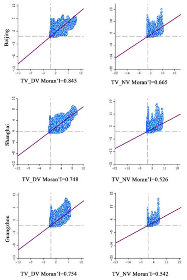 Based on the scatter diagram of Moran’s I index, although there is a significant spatial correlation between the takeaway activity and urban activity, there is a large difference in the spatial correlation degree between the urban activity and takeaway activity among Beijing, Shanghai, and Guangzhou (Figure 7). Among them, the TV-DV and TV-NV in Beijing is 0.845 and 0.665, respectively; the TV-DV and TV-NV in Shanghai is 0.754 and 0.542, respectively; and the TV-DV and TV-NV in Guangzhou is 0.748 and 0.526, respectively. We note that Beijing’s takeaway vitality has the highest correlation with the urban vitality while Guangzhou has the lowest correlation. Moreover, the correlation difference of vitality in different time periods is also obvious, which shows that the correlation between urban takeaway vitality and DV is much greater than that between urban takeaway vitality and NV. This may result from the difference in human activities between the day and night, as well as the closure of most takeaways at night and fewer takeout orders.