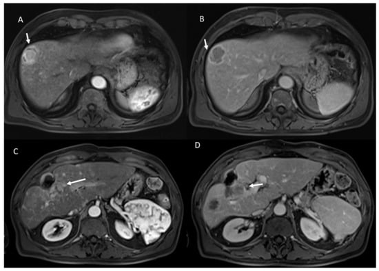 HCC on VIII hepatic segment: arrow shows APHE in arterial phase (A), with wash out and capsule appearance in portal phase (B). Post-treatment MRI: arrow shows APHE (C) and wash-out appearance in portal phase (D) in viable lesions.
