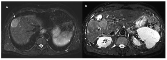 Ablation treatment is a minimally invasive tool that is commonly employed in the hepatic primary or secondary liver tumors [,,,,]. This treatment is considered a possible first-line tool in small hepatocarcinoma (HCC) or the best therapeutic choice for nonsurgical patients with early stage HCC []. Patients are required to have either a single tumor smaller than 5 cm or as many as three nodules smaller than 3 cm each and no evidence of vascular invasion or extrahepatic spread [,]. Tumor size is a prognostic aspect to expect the outcome of therapy. The target tumor should not exceed 3–4 cm in longest axis to ensure complete ablation with most of the currently available devices [,,,,,].