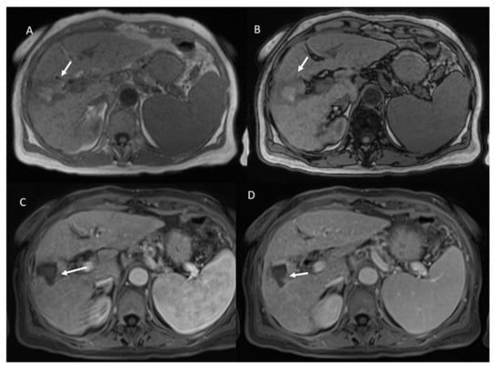 Non-viable treated HCC. In T1-W sequences (A, in phase and B, out of phase) the arrow shows hyperintense SI of ablated area. During contrast study the non-viable lesion shows hypointense SI in arterial (C) and portal (D) phase.