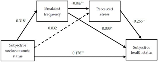 Earlier studies have shown that skipping breakfast is associated with poor mental health, and more frequent breakfast skipping results in higher perceived stress among adolescents [,]. High stress was also found to have negative effects on adolescents’ subjective health []. Notably, it was found that adolescents’ perceptions of SES become more strongly linked to their subjective health [] as adolescents are expected to become more aware of and responsive to social hierarchies []. However, the role of important health behaviors or statuses, such as the frequency of eating breakfast and perceived stress level, in the relationship between subjective health status and household SES has not been clearly determined. Therefore, this study examined the direct effects of subjective SES on the subjective health status of multicultural households with adolescents; we also examined the causal relationship between dietary behavior and perceived stress on subjective health status. Therefore, we proposed the following hypotheses.