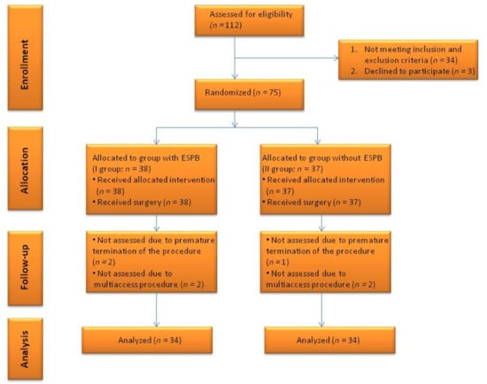 Between January 2019 and May 2020, 112 patients with kidney stone disease were referred to our department to perform PCNL, 75 of whom were eligible for participation in the study and provided their informed consent. They were randomized to one of two groups. Randomization was performed with closed opaque envelopes with 1:1 allocation. The experimental group (group 1) consisted of patients who received ESPB right before general anesthesia and the control group (group 2) was without ESPB. After the surgery, seven patients were disqualified from the study. Finally, the first and the second group consisted of 34 patients for whom data were analyzed (
