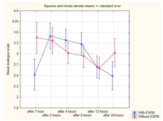 Table 3). However, we found that VAS after one hour postoperatively was significantly lower in patients who received ESPB (2.3 vs. 3.3;