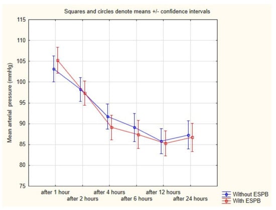 Mean arterial pressure (MAP = 1/3 systolic blood pressure + 2/3 diastolic blood pressure, mmHg) assessed 1, 2, 4, 6, 12, and 24 h postoperatively;