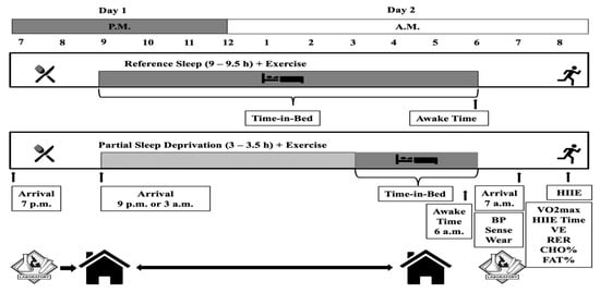 This study was a subpart of a project that examined acute-partial sleep deprivation and cardiometabolic/autonomic nervous responses to HIIE [4,5]. A within-subject randomized crossover experimental design with two experimental conditions was employed. Each experimental condition was completed in a serial manner, with measurements performed the evening of day 1 and the next morning of day 2 (see Figure 1).