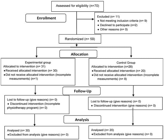 Study participants comprised 50 older women aged over 60 years (see Table 1). The participants were divided randomly into two groups: an experimental (30 women) and a control (20 women) (see Figure 1). Qualification was based on simple randomization (a coin toss) and was carried out by the main author. The experimental group took part in Pilates sessions two times per week for three months. The control group did not participate in such sessions but also did not participate in any other rehabilitation programs or additional physical activity except everyday activities. All participants declared that they would not take part in other sports activities during the project.
