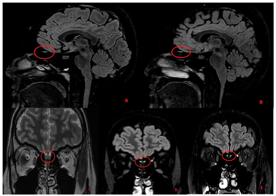 In the images above, we can see the hyperintensity of both olfactory bulbs (Panel A,B, sagittal FLAIR images) and olfactory tracts (Panel C coronal T2 FRFSE image; Panel D,E coronal FLAIR images) in the sequences obtained in the first magnetic resonance (MR) executed on the patient. In the coronal T2 FRFSE sequence (Panel C), we can also see that both olfactory tracts are swollen and hyperintense in their central portion, and that is even more evident for the right olfactory tract.