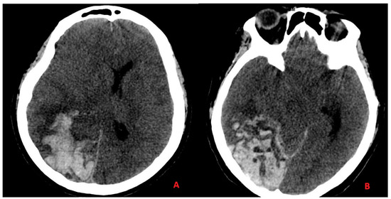 Acute ischemia with hemorrhagic infarction in the absence of any vascular malformation with acute quote of cerebral edema showed on CT head scan images. In panel (A), we can see the hemorrhagic infarction of the parietal and temporal lobes, with edema on the white matter of the antero-lateral portion of the temporal lobe with added “mass effect” on the adjacent structures. In panel (B), we can see the hemorrhagic infarction of the occipital and temporal lobes, and the subarachnoid hemorrhage on the cerebellar tentorium margin.
