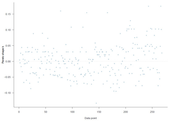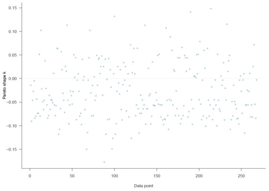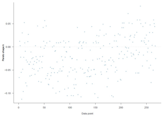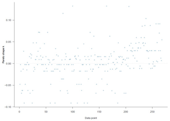 Similar to model 1, the second model exhibits a high goodness-of-fit with the data (k < 0.5, see Figure 7). The effective sample size (n_eff > 1000) and Gelman shrink factor (Rhat = 1) of all simulated posteriors portray a good convergence of Markov chains (see Table 3). Posterior coefficients’ trace plots, Gelman plots, and autocorrelation plots all demonstrate a good convergence signal (see Figure 8, Figure A3, Figure A4).
