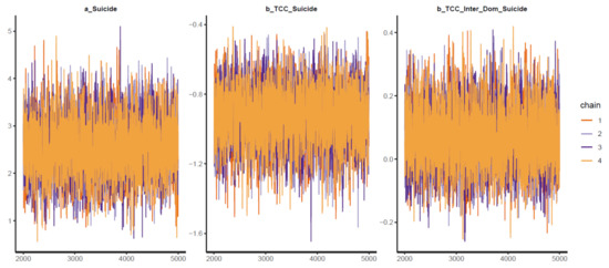 Good Pareto k estimates (k < 0.5) in the PSIS diagnostic plot show that the model fits the data (see Figure 3). As shown in Table 2, all simulated posteriors’ effective sample size (n_eff) is larger than 1000. Each trace plot with four Markov chains fluctuating around a central equilibrium shows good convergence (see Figure 4). There is almost no difference between the between-chain variance and within-chain variance as the shrink factors reduce to one during the warm-up phase (see Figure A1). The Markov property is held because the autocorrelations of MCMC-simulated samples eliminated quickly to 0 (see Figure A2).