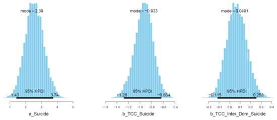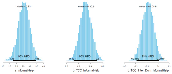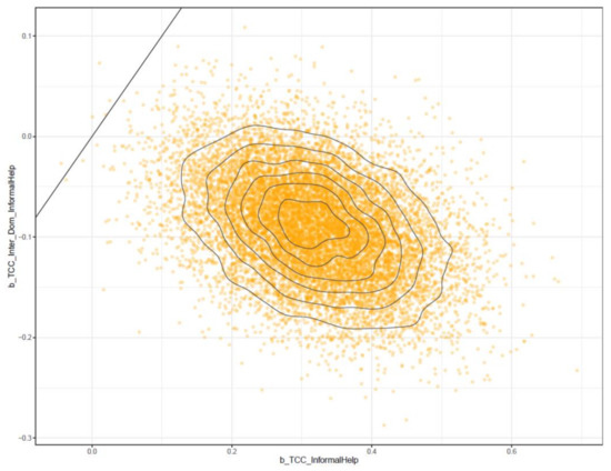 The total sense of connectedness is found to positively influence informal help-seeking behaviors ( = 0.31 and = 0.10), which is relatively intuitive. In contrast, the interaction produces a negative value, suggesting the lower effect of sense of connectedness on help-seeking behavior among international students ( = −0.09 and = 0.04). The distribution of TCC*Inter_Dom falls almost entirely in the 95% the Highest Posterior Distribution Intervals (HPDI) range, indicating high reliability of the effect (see Figure 9). We can also see that the majority of simulated samples are located on the positive side of TCC (x-axis) and the negative side of TCC*Inter_Dom (y-axis) in the pairwise distribution graph (see Figure 10). These distributions, again, hint at the high reliability of TCC’s and TCC*Inter_Dom’s impacts on InformalHelp.