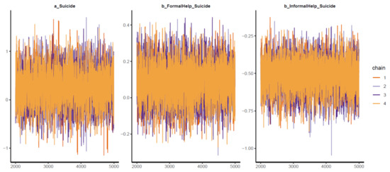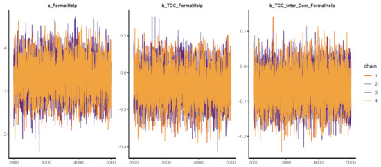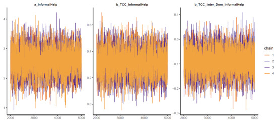 For conducting the analysis, we initially downloaded the data from its online repository and then generated necessary variables (InformalHelp and FormalHelp) in addition to the existing ones. It should be noted that the variable TCC is not available in the published dataset, so we have attached a sufficient dataset and codes in the Supplementary for future replication. The data were later uploaded to the R software (version 4.0.2) and analyzed using the bayesvl package [35,36,37]. The package has been utilized for multiple studies in various fields [38,39,40,41]. The simulation setup was organized with 5000 iterations (2000 are warm-up iterations), four Markov chains, and four cores. We used the Pareto smoothed importance-sampling leave-one-out cross-validation (PSIS-LOO) approach to check for goodness-of-fit [42]. The Gelman and autocorrelation plots were also visualized to check whether the Markov property is achieved. Since no study of the same type has been conducted, all estimations’ priors were set as uninformative [31], which is equivalent to a normal distribution with mean = 0 and standard deviation = 10.