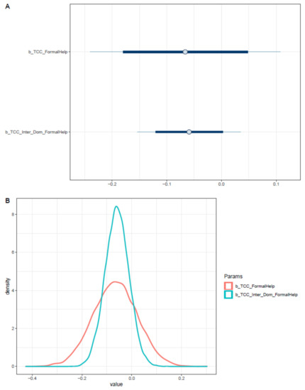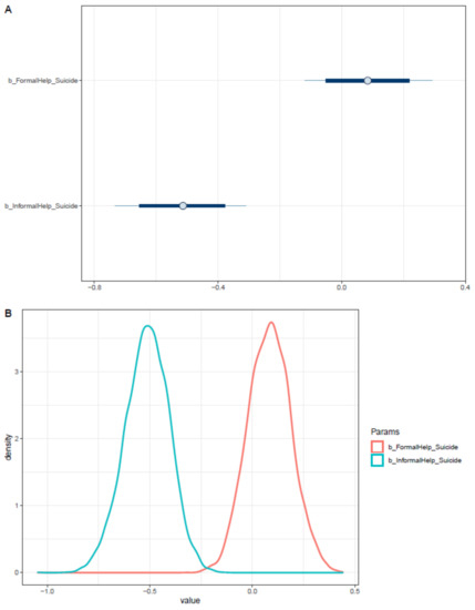 Distributions of Model 3′s posterior coefficients. (A)—Interval plot; (B)—Density plot.