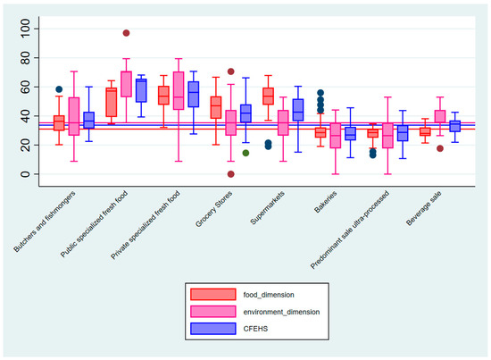 Figure 1 illustrates the Box Plot with the extent and variability of data according to the different types of food retailers. It is possible to visualize in the box the median, minimum and maximum values, and interquartile ranges for the scores. It is also possible to verify variations in the CFEHS score and its dimensions within the same category of establishments and between different types. The three continuous straight lines in the x-axis show the mean score in their three dimensions. In the food dimension, we observed outliers (extreme values) for both butchers and fishmongers as well as for bakeries and food retailers with the predominant sale of ultra-processed food; still, in this dimension, we also observed that the public specialized indoor fresh food markets have the highest median. In the environment dimension, we observed outlier values into two categories as public specialized indoor fresh food markets (also with this higher median size) and grocery stores. In CFEHS outliers, we found that grocery stores and the public specialized fresh-food market showed the high median.