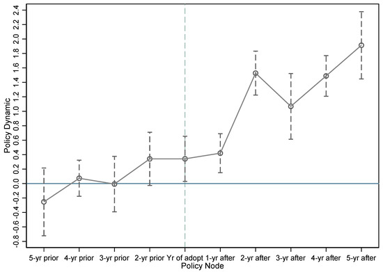 where t0 represents the time when the low-carbon pilot policy was introduced, K represents the k-th year after the policy was introduced, and Zr,t0+k are dummy variables indicating the k-th year after the city r was included in the low-carbon city pilot scope (the value range of K is [−5,5], which covers the 5 years before and after the policy, was issued. If the time exceeds five years, then it is still set to five years in the model). Meanwhile, the estimated coefficient βK reflects the difference in the number of green patent applications between the processing and control groups K years after the introduction of the pilot policy. When k is less than 0 (before the introduction of the policy) if the trend of βK is stable and fluctuates around 0, then the parallel trend hypothesis is satisfied. Otherwise, a significant difference is observed between the two groups before the introduction of the pilot policy, thereby rejecting our hypothesis. The test results are shown in Figure 1. We took the previous period of the policy as the benchmark group, the vertical axis as the dynamic effect of the policy (represented by the value of βK), and the horizontal axis as the time of the policy. Figure 1 shows that before the introduction of the pilot policy for low-carbon cities, βK fluctuates around 0, thereby indicating no significant differences between the treatment and control groups before the introduction of the policy. This finding is comparable and conforms to the parallel trend hypothesis. Specifically, in the year when the policy was issued and several years after, βK remained positive and significant. Despite the large fluctuation in the second and third years, the overall trend was still on the rise, thereby suggesting that the pilot policy of low-carbon cities increased the number of green patent applications of enterprises and that such promotion effect was gradually enhanced.