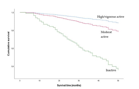 Survival without adjustments among physically inactive, moderately active, and highly/vigorously active women and men are presented in Figure 1 and Figure 2, respectively. The adjusted Cox proportional hazards regression model is presented in Table 2. There was a significant interaction between PA and sex (HR 0.28 (0.15; 0.53), p < 0.001), and the analyses were stratified by sex.