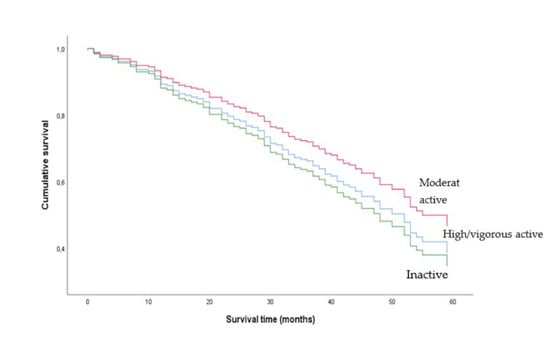 Unadjusted Kaplan-Meier plot of women who were moderately physically active, highly/vigorously active and inactive. Physical activity levels were determined using the Saltin–Grimby Physical Activity Level Scale.