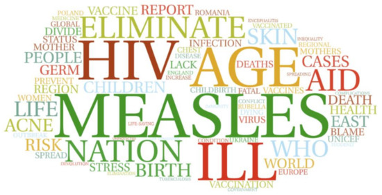 The only topic concerning infectious diseases that connected all the countries in a similar way was measles. According to the WHO, measles emerged worldwide in 2019 reaching the highest number of reported cases in 23 years. The highest numbers of cases were recorded in 2018 and 2019, both in the east and in the west and south of Europe (A: 4–8). There was a widespread consensus that this was due to the lack of vaccination of an appropriate percentage of people in individual countries. Eastern European countries of the EU and non-EU countries were in a relatively better situation. As a legacy of socialism, there is still considerable vaccination coverage of the population, especially in middle and older age brackets [73]. The growing group of vaccine sceptics has only emerged now in the era of migration to a much more sceptical Western Europe. Moreover, numerous economic and political problems of Ukraine resulted in the postponement of measles vaccination a few years ago [74]. Sudden outbreaks of the disease also appeared in Poland, which is estimated to host 2 million economic immigrants from Ukraine (A:7), as reported in 2019 by the Daily Mail.
