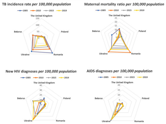 Alarming rates of anti-TB drug resistance are being studied together with increasing incidence rates of HIV infection in Eastern European countries [71]. The clear leader among studied countries by HIV morbidity is Ukraine. Country by the incidence rate at the beginning of the 2000s, was treated as a crisis region of Eastern [66]. Belarus as well has been mentioned among crisis areas in Europe, especially in the 1990s. UK rates for new HIV diagnoses per 100,000 in the early 2000s were much higher than in Poland, Romania and Belarus (Figure 2) [72].