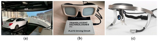 Experimental apparatuses in the experiment. (a) Driving simulator; (b) PLATO goggle; (c) Dikablis eye- tracker.