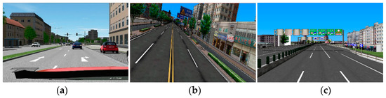 The three simulated environments. (a) urban road; (b) rural road; (c) motorway.