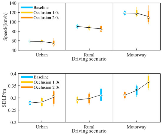 Driving speed and standard deviation of lateral position (SDLP) were analysed to investigate longitudinal control and lateral control performance, respectively. Driving speed and SDLP per occlusion duration in different driving scenarios are illustrated in Figure 3.