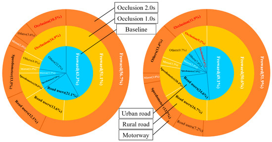 It should be noted that there were still some Occlusions and Others before eyes-off-road, especially in the motorway. These Occlusions and Others could be regarded as part of visual spare capacity which varied with the demand of driving scenarios. In some way, the amount of Occlusions and Others could indicate spare capacity. As it is difficult to know with certainty how much spare capacity is contained in the “default” forward attention. Considering that motorway has the least demand for attention, participants have the largest amount of spare attention (11.9% Occlusions + 13.4% Others) in addition to observing the necessary traffic information, while there were only 7.6% Occlusions and 7.6% Others in urban road, which indicated that driver tried to spend more attention in observing the development of the situation to adapt to the demands of the situation. In some way, the spare attention before eyes-off-road can be interpreted as an indicator of a situation-aware use of secondary tasks in the vehicle.
