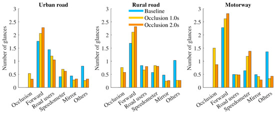 As presented in Figure 5, the distribution pattern of glance number to each AOI before occlusions among the three different scenarios were very similar. As expected, Forward and Speedometer were both glanced more frequently in the two occlusion conditions, and the number of glances looking at Speedometer was significantly higher in occlusion 2 s condition. In contrast, drivers reduced Occlusion times in occlusion 2 s condition. In addition, participants tended to glance at the Road users more frequently with the increasing complexity of driving scenario, especially in urban road, but this effect became less pronounced in the occlusion conditions. When driving in the motorway, gaze was directed more often to Speedometer. In combination with the analysis of attention ratio, it could be seen that the number of glances looking at the Forward was disproportionately higher in the motorway. It implied that glances duration to Forward area in the motorway was shorter than those in the urban and rural road.