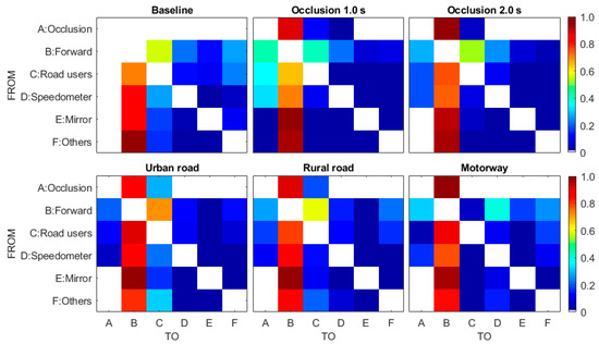 To shed further light on drivers’ attention strategy before occlusion, attention transition among different gaze targets was calculated to examine visual search patterns. Transition probabilities between different glance targets and occlusion are presented in Figure 6. Note that glance transition was calculated in this study, not the gaze transition, so there is no self-transition.