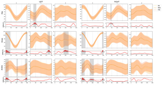 Figure 3 shows the results of the SPM repeated measures ANOVA comparing the three instants of the test (INI, MID, and FIN). Significant differences (p < 0.05) were shown in almost all the joints involved in pedaling. The differences in knee flexion–extension in the phase close to 0° of the crank, in ankle flexion–extension in the phase close to 0° and 180° of the crank, and in the adduction–abduction of both hips during the propulsion phase (50–100° of crank approximately) are noteworthy.
