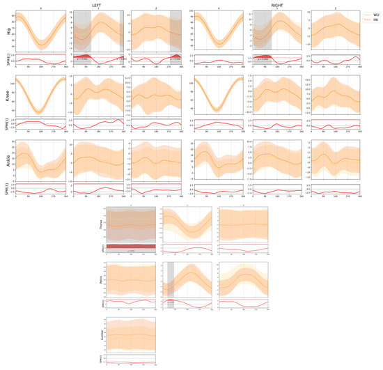 Comparison of the joint and segment angles between the warm-up and the initial part of the test. Lower panels display statistical parametric mapping t values from the t-test, with the dotted line representing the critical threshold. Red and grey shaded areas indicate statistical differences among conditions. Horizontal values represent one Pedaling cycle, starting from the top position of the same side pedal. WU: measurement when starting the warm-up. INI: measurement at 0 min of the test. SPM: statistical parametric mapping. x, y, z: movement in the sagittal, frontal, and transverse plane, respectively.