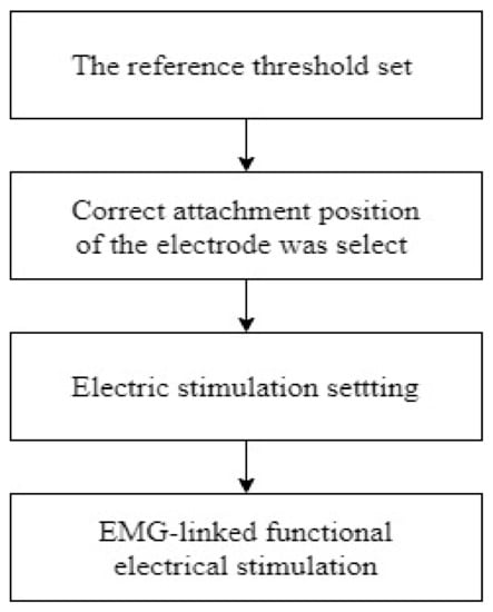 Functional Electrical Stimulation (FES) is a method that is widely applied to recover the function of stroke patients. Using this this method, an electrical stimulation is applied to the paralyzed or weakened muscle to induce muscle contraction. Through this process, it is possible to prevent muscle atrophy, maintain muscle tolerance, strengthen muscle strength, and retrain functional movements [,]. Kroon and IJzerman [] have stated that, unlike simple repetitive stimulation, such as conventional electric stimulation, improvements in symptoms require an active will and motivation of the patient to move the paralyzed side by himself/herself. EMG (electromyography)-linked electrical stimulation is a method of inducing muscle contraction by delivering electrical stimulation to peripheral nerves when an electrical signal, generated by a patient’s voluntary movement effort, exceeds a threshold value set in the EMG. The reasons why EMG-Triggered electrical stimulation can exhibit a better effect than simple electrical stimulation are described as follows. First, repetitive passive exercise by simple electric stimulation does not involve concentration or eccentric motor nerve mobilization by cognitive function. However, during EMG-triggered electrical stimulation, there is a continuous increase in concentration to move muscles used. Second, a weak activation of the motor function occurs so that patients can move target muscles willfully. Third, this method can be applied to the theory of sensorimotor integration that is simultaneously or sequentially integrated in the cerebrum. Examples include feedback of proprioceptive sensation by movement of target muscle, transmission of somatosensory electrical stimulation, and so on [].