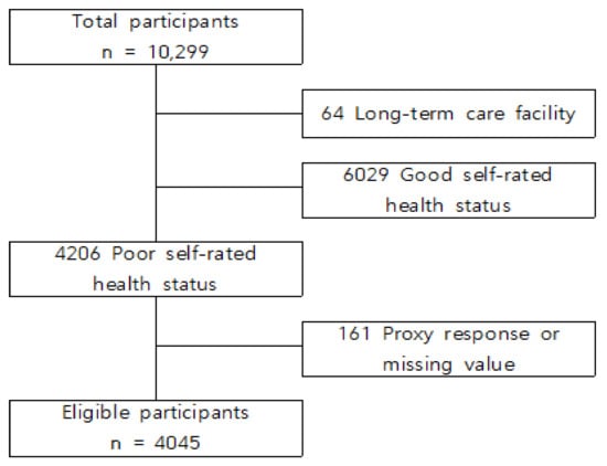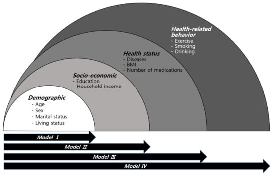 - The Korean Institute for Health and Social Affairs. 2017 National Survey of Older Koreans: Findings and Implications; The Korean Institute for Health and Social Affairs: Seoul, Korea, 2018. [Google Scholar]
