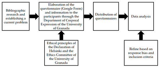 As shown in Figure 1 of the study procedure, scientific research was carried out in order to gather information and clarify some of the current problematic situations in society. Afterwards, the Department of Didactics of Musical, Plastic and Corporal Expression of the University of Granada created a Google form with the specified instruments, describing the study aim, as well as accepting participation by sending the form. Several routes were used to administer the questionnaire, including social network dissemination. Two questions were duplicated in order to check that they had not been filled in randomly and to ensure the reliability of the answers. Therefore, the correct bias of the answers was ensured. Even so, 53 questionnaires were excluded because they did not comply with the inclusion criteria or were incorrectly completed. Research ethics principles established by the Declaration of Helsinki [35] were followed in this study, ensuring anonymity and respecting participants’ rights. In addition, research approval was granted by the Ethics Committee of the University of Granada (1230/CEIH/2020).