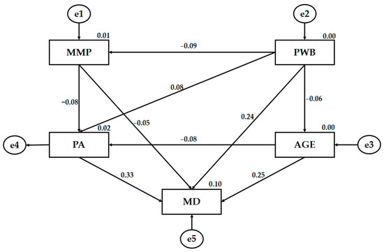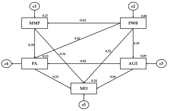Nevertheless, as the fit values were close to acceptable values, some statistically significant relationships were obtained. Figure 5 and Table 3 show the regression weights for the female model. In this case, the most influential variable was MD, as it was positively related to BP (p < 0.001; r = 0.331), determined by a medium regression weight strength, and it was also associated with PWB (p < 0.01; r = 0.253) and age (p < 0.01; r = 0.245), showing a low-strength regression effect. For the other relationships proposed in the model, no statistically significant differences were observed.