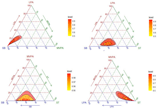 As it can be observed in Figure 1, the highest codependences were ST with SB, followed by LPA with MVPA. On the other hand, the lowest codependences were between SB and MVPA, followed by ST and MVPA. The distribution of the sample composition is illustrated in Figure 1 by means of a matrix of ternary plots with three behaviors represented at the same time. Ternary plots can be understood as the scatterplots of compositions [43]. The plot reflects the fact that the highest variability was found in the direction of SB.