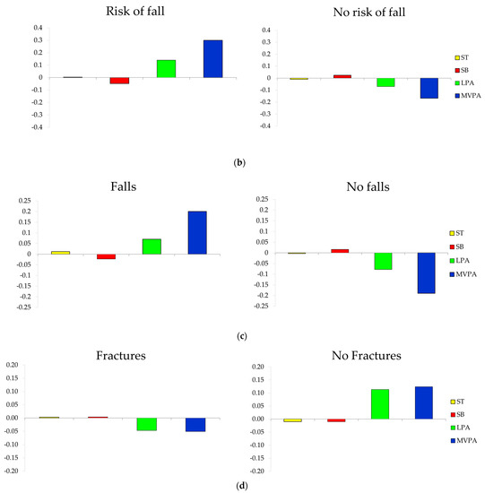 Compositional analysis of the relative importance of the group mean time spent in ST (sleep time), SB (sedentary Behaviors), LPA (light physical activity), and MVPA (moderate-to-vigorous physical activity) with respect to the overall mean time composition of (a) those who had and did not have a fear of falling, (b) those who had and had not suffered falls in the last year, (c) those who were and were not at risk of falling, and (d) those who had or had not suffered fractures in last 10 years.