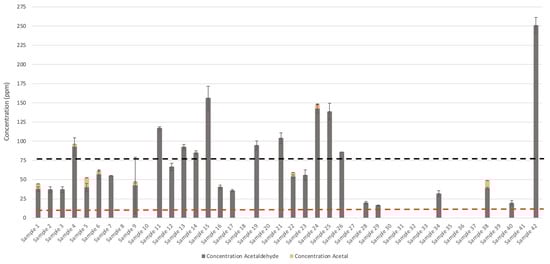 Methanol concentrations were below 200 µL L−1 in accordance with USP criteria, ranging from below limited of detection (LOD) to 47 ± 2 µL L−1 (Figure 1). Acetaldehyde appeared to be the most common impurity in ABHRs analyzed, with 28 samples containing acetaldehyde concentrations from 17 ± 0.5 µL·L−1 to 251 ± 10 µL·L−1 (Figure 2). Acetal concentrations were between <LOD to 12 ± 0.3 µL·L−1, with only two samples exceeding 10 µL·L−1. Eleven of these samples exceeded the interim Health Canada guidelines on acetaldehyde and 17 samples exceeded the USP monograph for combined acetal and acetaldehyde. Acetaldehyde is produced through the oxidation or metabolism of ethanol by yeast and bacteria []. Reversible conversion of acetal to acetaldehyde can also occur in the presence of ethanol and acidic catalysts [,]. Therefore, for compliance of an ethanol product with USP and Health Canada requirements it is necessary to include the total acetal and acetaldehyde content to account for this conversion.