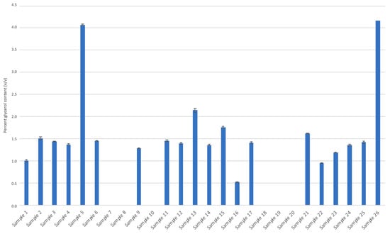 Many of the ABHRs in this study exhibited the presence of humectants (e.g., glycerol and 1,2-propanediol). Humectants are typically added to ABHRs as a moisturizing agent and to encourage hand hydration []. In the liquid ABHRs analyzed, 20 of 26 samples contained glycerol ranging between 0.52% ± 0.01% and 4.0% ± 0.01% (v/v) (Figure 4). However, there was a single sample identified (sample 26) with a glycerol content of 4.2% (v/v). The current formulations of hand sanitizer suggested by the World Health Organization are either 80% (v/v) of ethanol or 75% (v/v) isopropanol mixed with 1.45% glycerol (v/v) []. Most of the liquid glycerol-containing ABHRs analyzed appeared to comply with this formula. Similarly, 1,2-propanediol was identified in a few samples. This compound is the second-most-used humectant in cosmetic products and is generally recognized as safe []. Similar to glycerol, this compound is general used in small concentrations, typically between 2% and 5% []. Nevertheless, these hand sanitizers were not labeled to indicate the presence of the 1,2-propanediol.
